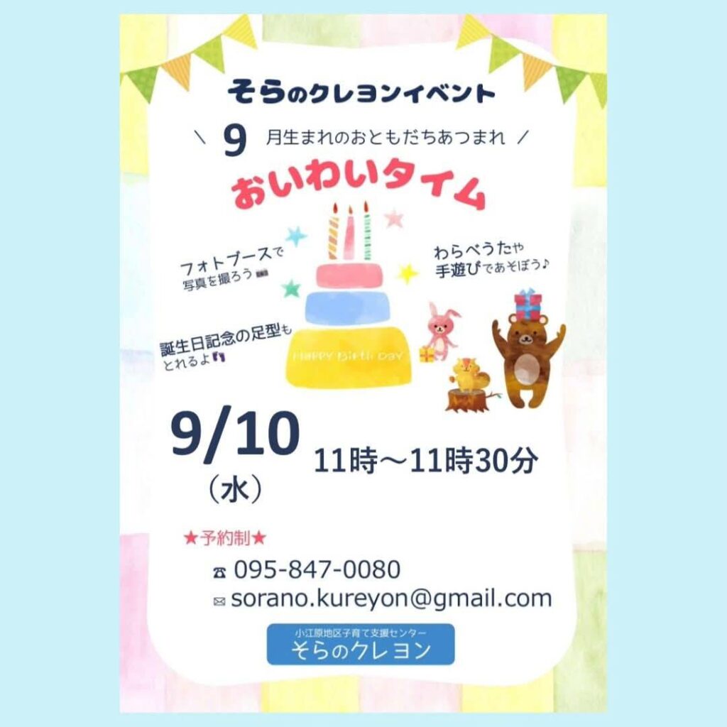⚠️当日10時以降のキャンセル連絡は、直接そらのクレヨン0958470080へお電話ください。