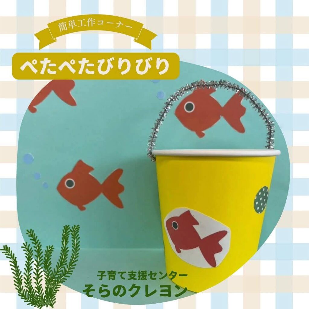 紙コップにかわいい金魚を貼りましょう。