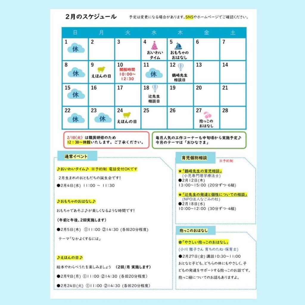 そらのクレヨン2/10(火)は、10時~12時30分まで開館します。