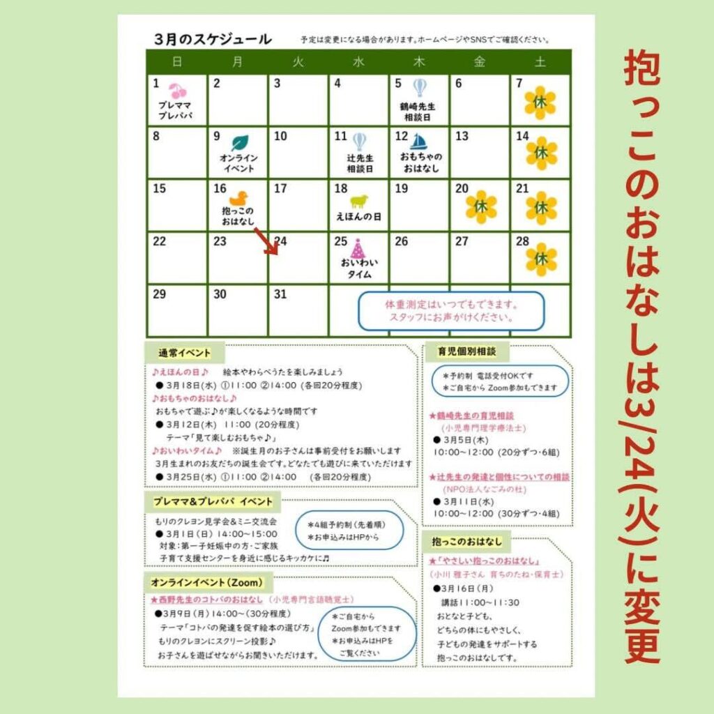 3/16(月)に予定していた「もりのクレヨン抱っこのおはなし」は講師の体調不良のため、3/24(火)に変更いたします。
